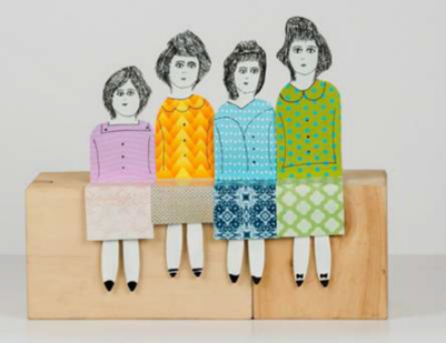 Objeto arte elaborado a mano en lámina de hierro recortada y decorada con recortes y pintura. No hay dos iguales. Representa la amistad y la hermandad. Lleva un doblez que crea el efecto de estar sentadas. Ideal para adornar una repisa.