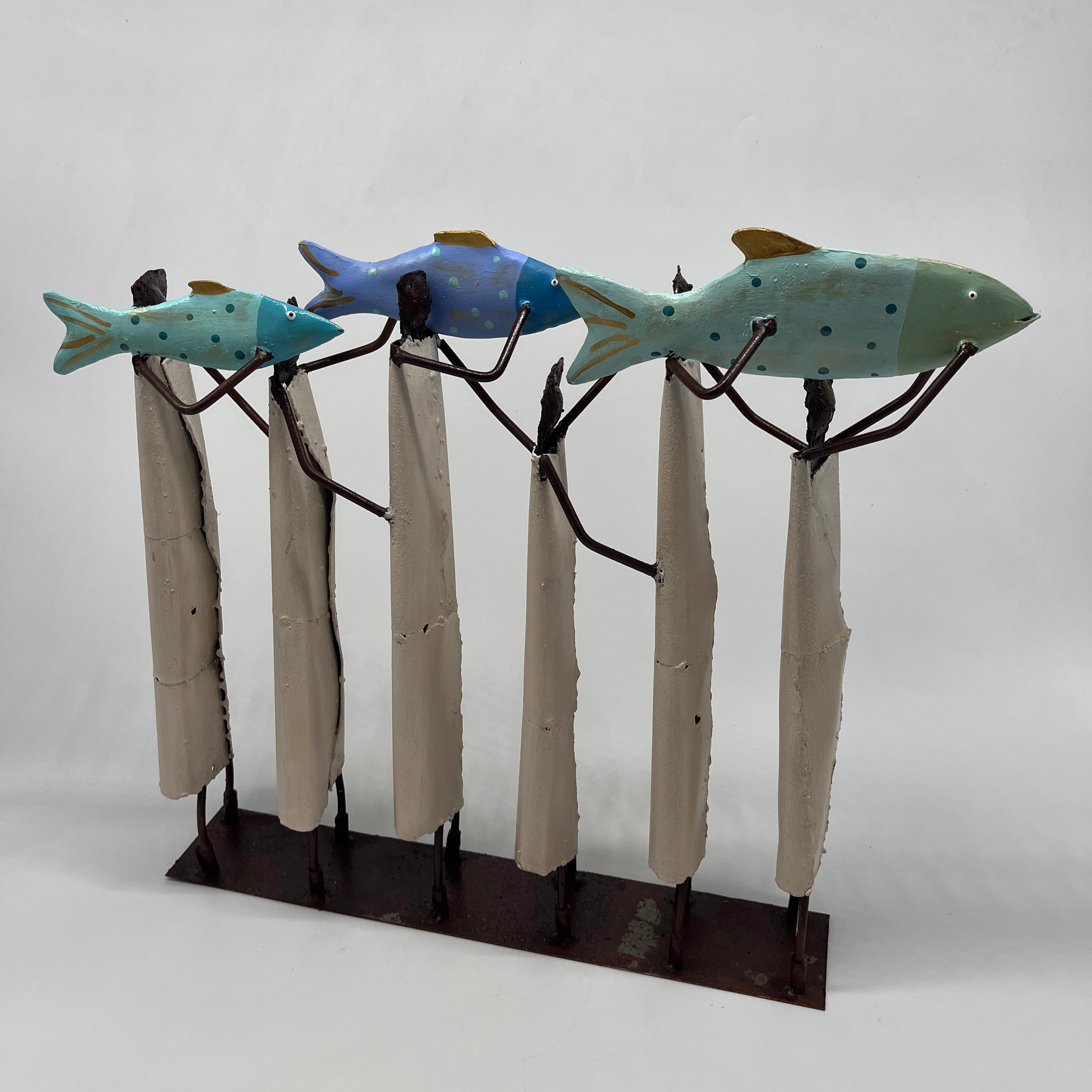 Artesanía en metal. Objeto de arte hecho a mano. Fila de personajes que van cargando distintos objetos como jaulas, totumos o una canoa. Nos habla del trabajo en equipo, y cómo la carga se alivia entre todos. Sus vistosos trajes van pintados a mano. No hay dos iguales. No se puede seleccionar un colorido específico. Piezas únicas.