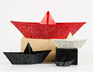 Escultura en lamina de hierro escrita a mano con distintos poemas, frases o refranes seleccionados por la artista. Es un objeto de arte y decoración, nostálgico. Vienen en cuatro tamaños y en tres colores crema rojo y negro.