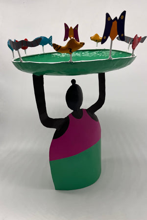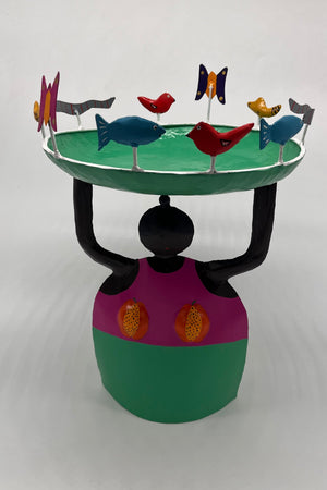 Female goddess, folk art in metal, hand-made and hand-painted in Colombia. It represents the feminine force that creates and engenders life. It is a version full of color and exuberance that symbolizes Mother Nature. This version is a container or fruit bowl.