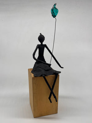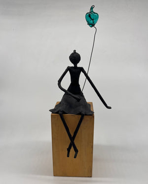 Handmade metal sculpture. A girl sitting and holding a heart-shaped glass globe in the air. Innocent and naive. Cheerful and original.