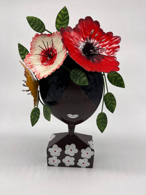 This popular art object is the head of a mestiza woman adorned with tropical flowers. An unusual, cheerful and unique decoration. Made entirely of metal by hand.