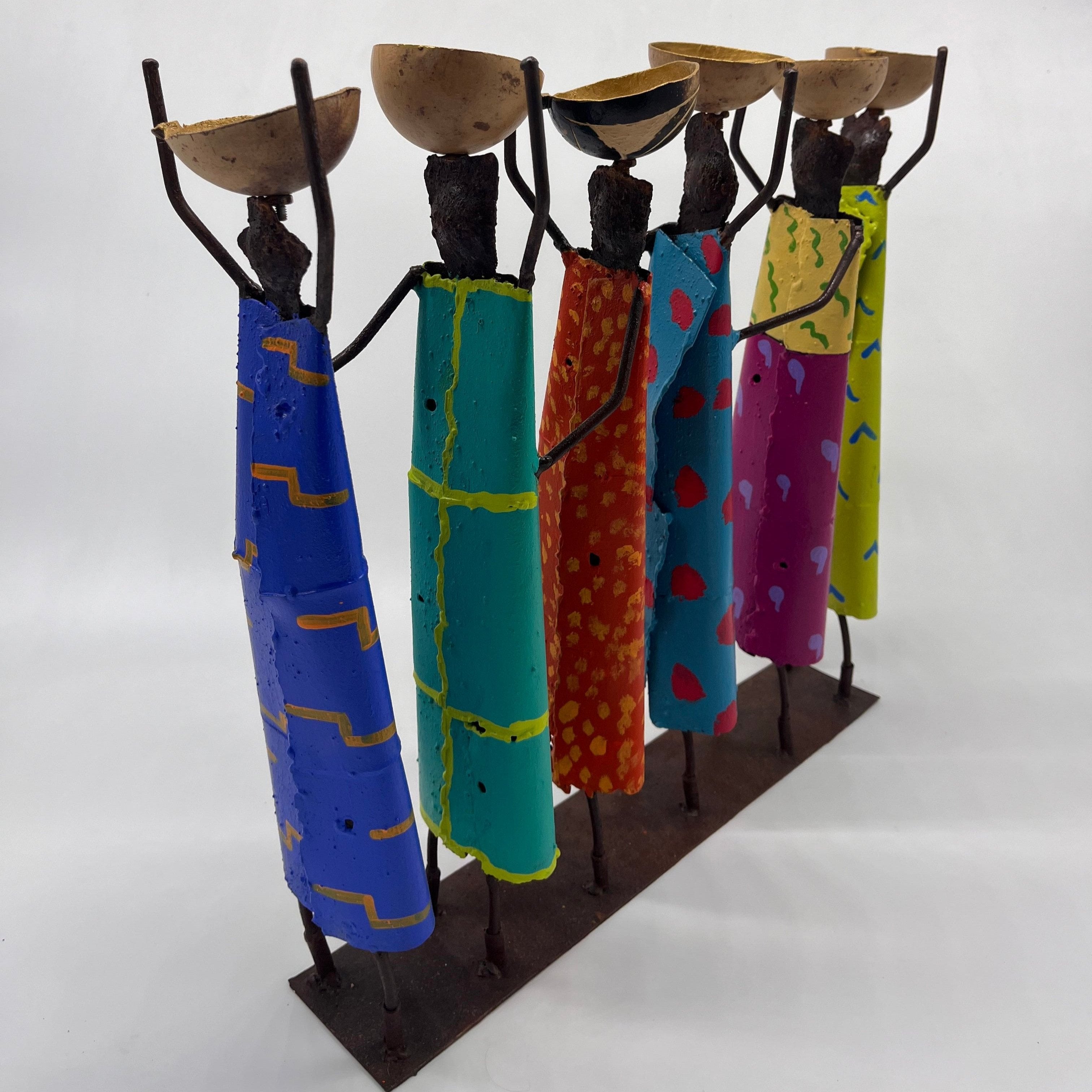 Artesanía en metal. Objeto de arte hecho a mano. Fila de personajes que van cargando distintos objetos como jaulas, totumos, o una canoa. Nos habla del trabajo en equipo, y cómo la carga se alivia entre todos. Sus vistosos trajes van pintados a mano. No hay dos iguales. No se pueden seleccionar un colorido especifico. Piezas únicas.