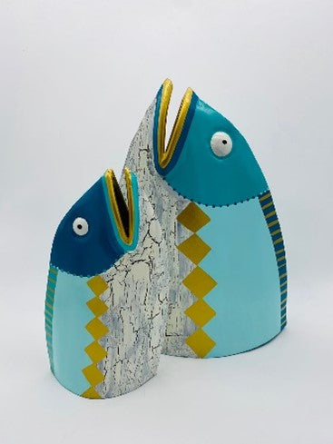 Escultura en metal en forma de cabeza de pescado. Puede ser de mesa o de colgar en la pared. Viene en dos tamaños. No hay dos exactamente iguales. No se pueden escoger los colores.